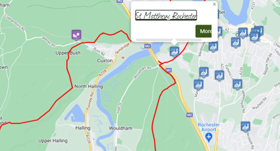 There is a direct route of The Pilgrims’ way that runs from Winchester directly to Canterbury but there is another route that takes two detours from the straight path. The deviated path runs from Winchester, along the North Downs to Sevenoaks where the path heads north to Southwark Cathedral. It then returns to the direct path for a short way until it heads through Cuxton to Rochester where it crosses the River Medway to Rochester Cathedral. The Way then passes to the south of Rochester and heads through Borstal to Burham, Boxley and Detling and then continuing on to Canterbury. This route means that when passing through Borstal, The Pilgrims’ Way passes by St. Matthew’s Church.